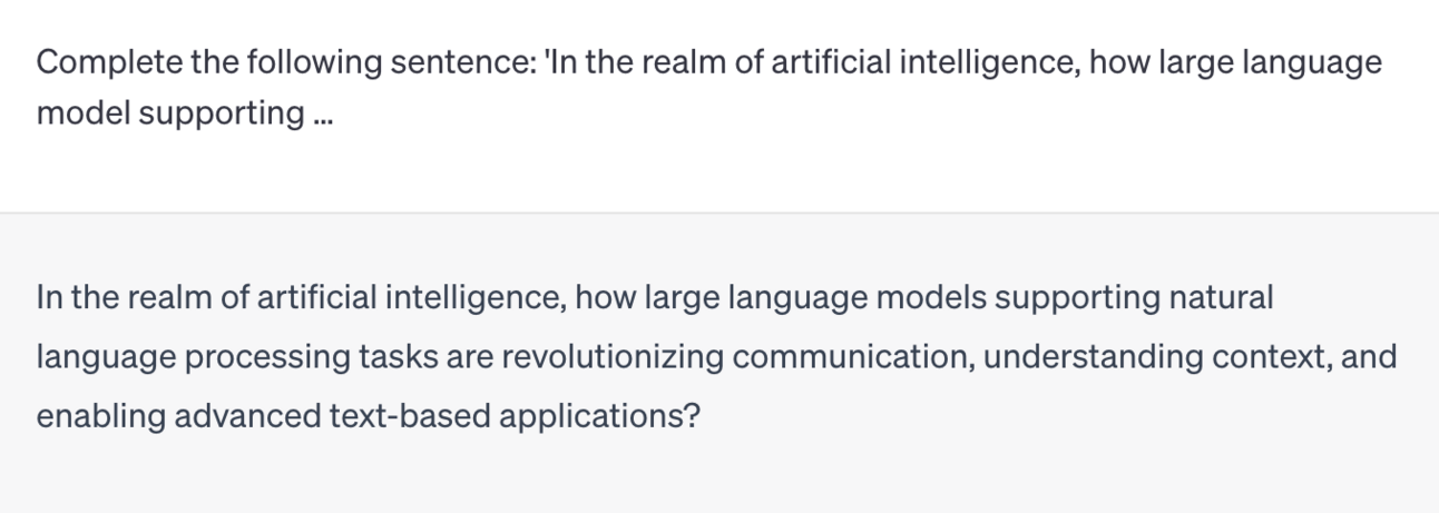 Example Prompt: “Complete the following sentence: ‘In the realm of artificial intelligence, how large language model supporting …’”