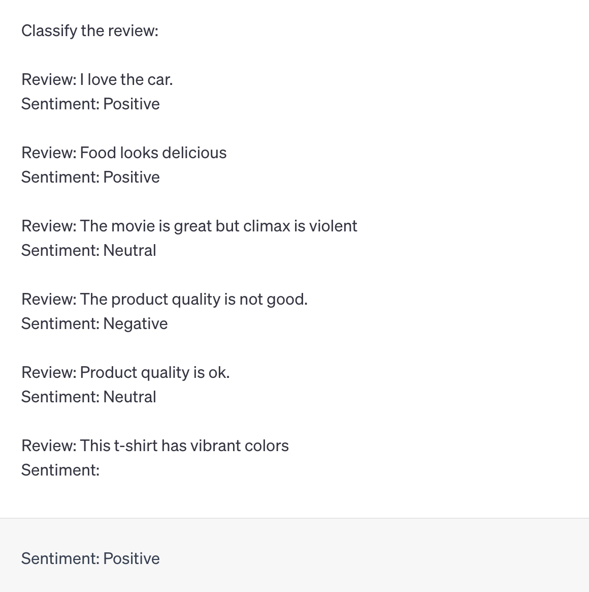 Few-shot learning extends one-shot learning by providing a small number (i.e. samples) of example inputs and outputs. These examples provide a strong understanding of the task and generate controlled and relevant responses.