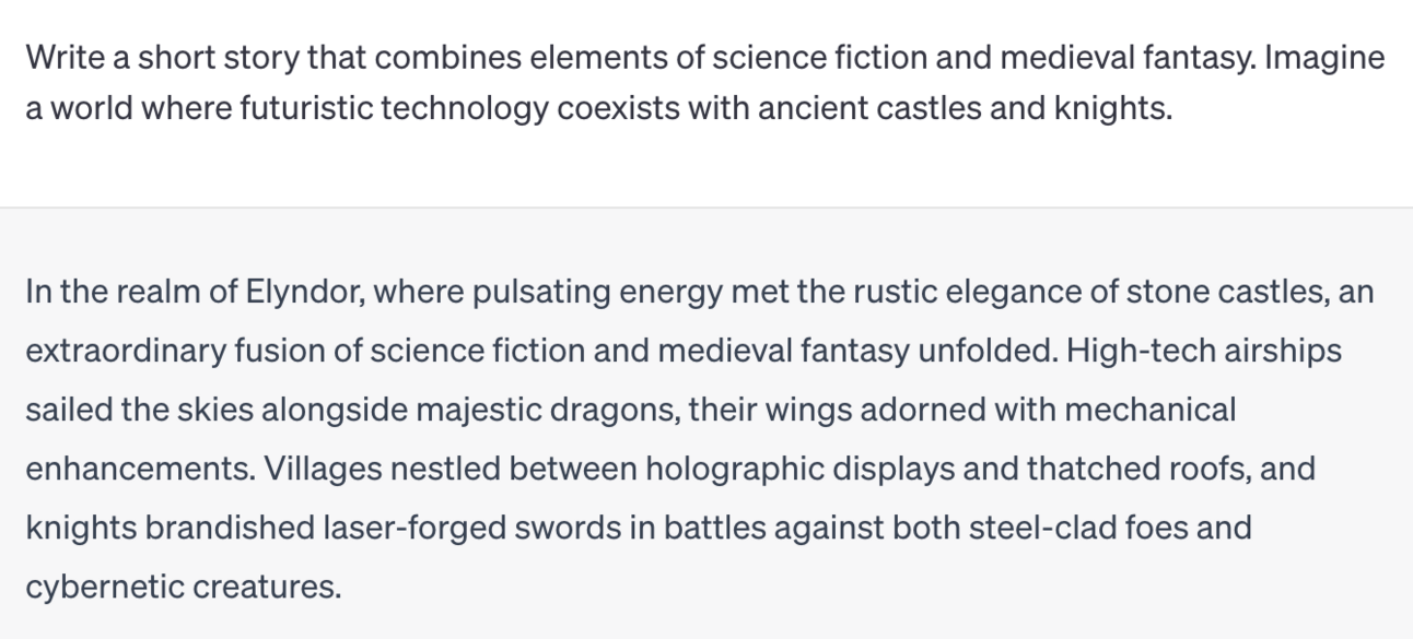 Example Prompt: “Write a short story that combines elements of science fiction and medieval fantasy. Imagine a world where futuristic technology coexists with ancient castles and knights.”