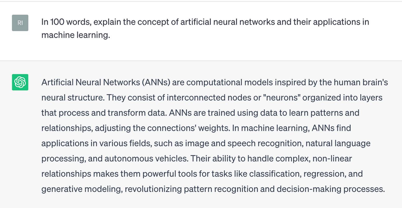 Example Prompt: “In 100 words, explain the concept of artificial neural networks and their applications in machine learning.”