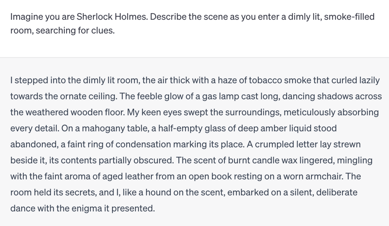 Example Prompt: “Imagine you are Sherlock Holmes. Describe the scene as you enter a dimly lit, smoke-filled room, searching for clues.”